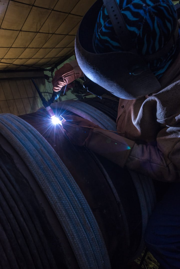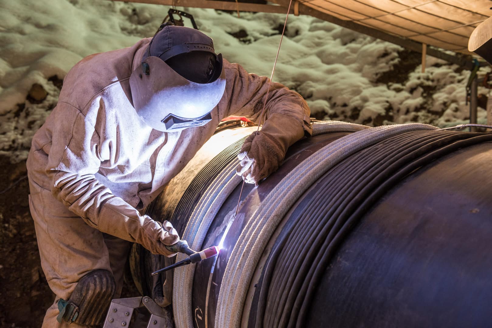 The existing pipe was spiral-welded and had been magnetized during a prior inspection using a smart pig. This magnetic charge initially made standard welding work impossible, as it could interfere with the arc.