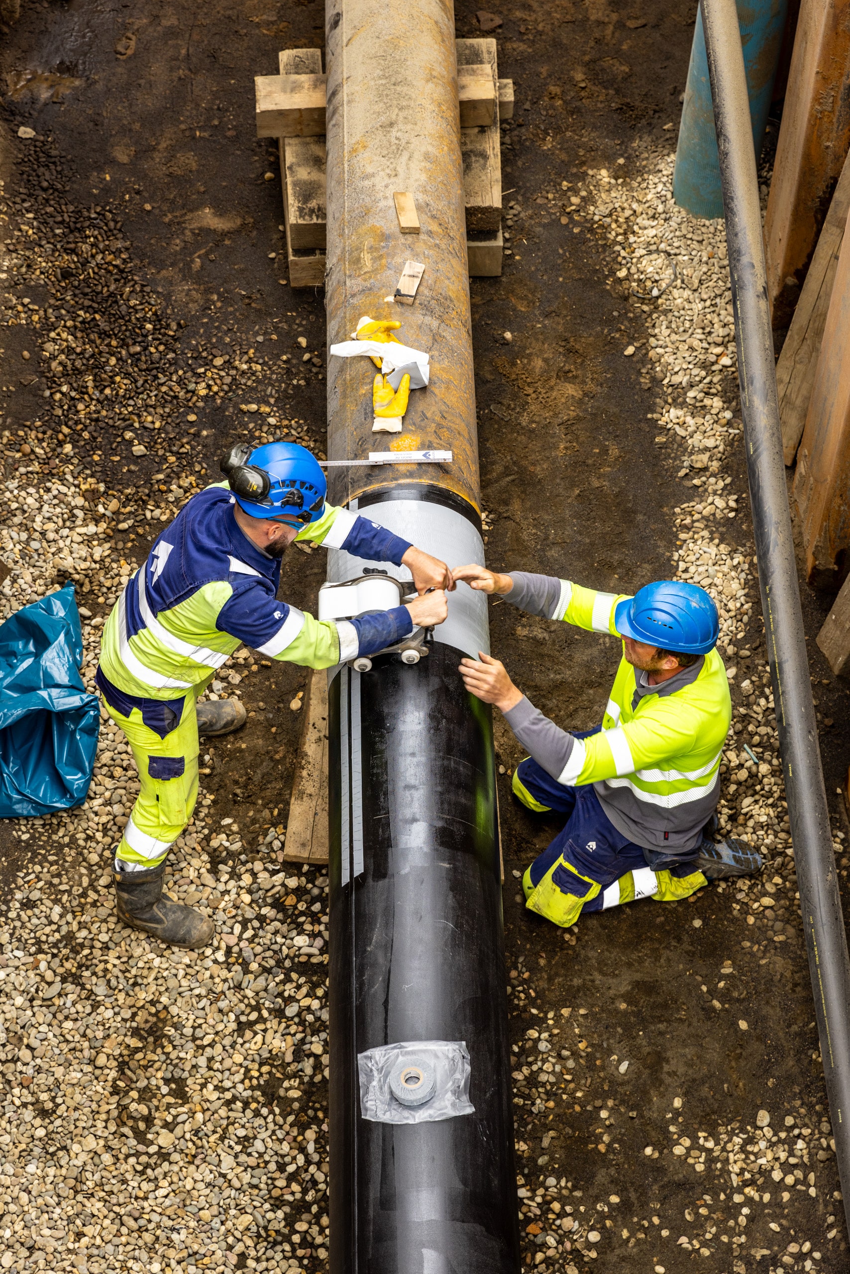 Das alte Rohr mit beschädigter bituminöser Umhüllung wurde abschnittsweise aus dem Mantelrohr entfernt. Die insgesamt 5 neuen Pipelineabschnitte wurden vorab vor Ort vorbereitet, in der Baugrube verschweißt und nach Prüfung der Schweißnähte mit PE-Band umwickelt. Rund 60m des Rohrs erhielten zusätzlich eine Umhüllung aus glasfaserverstärktem Kunststoff (GFK).